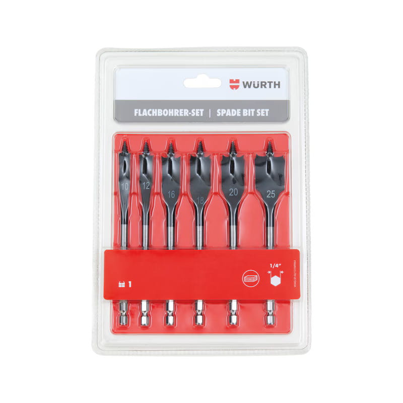 Komplet 6 wierteł płaskich łopatkowych Würth o różnych średnicach (najczęściej spotykany zakres: 10 mm, 12 mm, 16 mm, 18 mm, 20 mm, 25 mm).