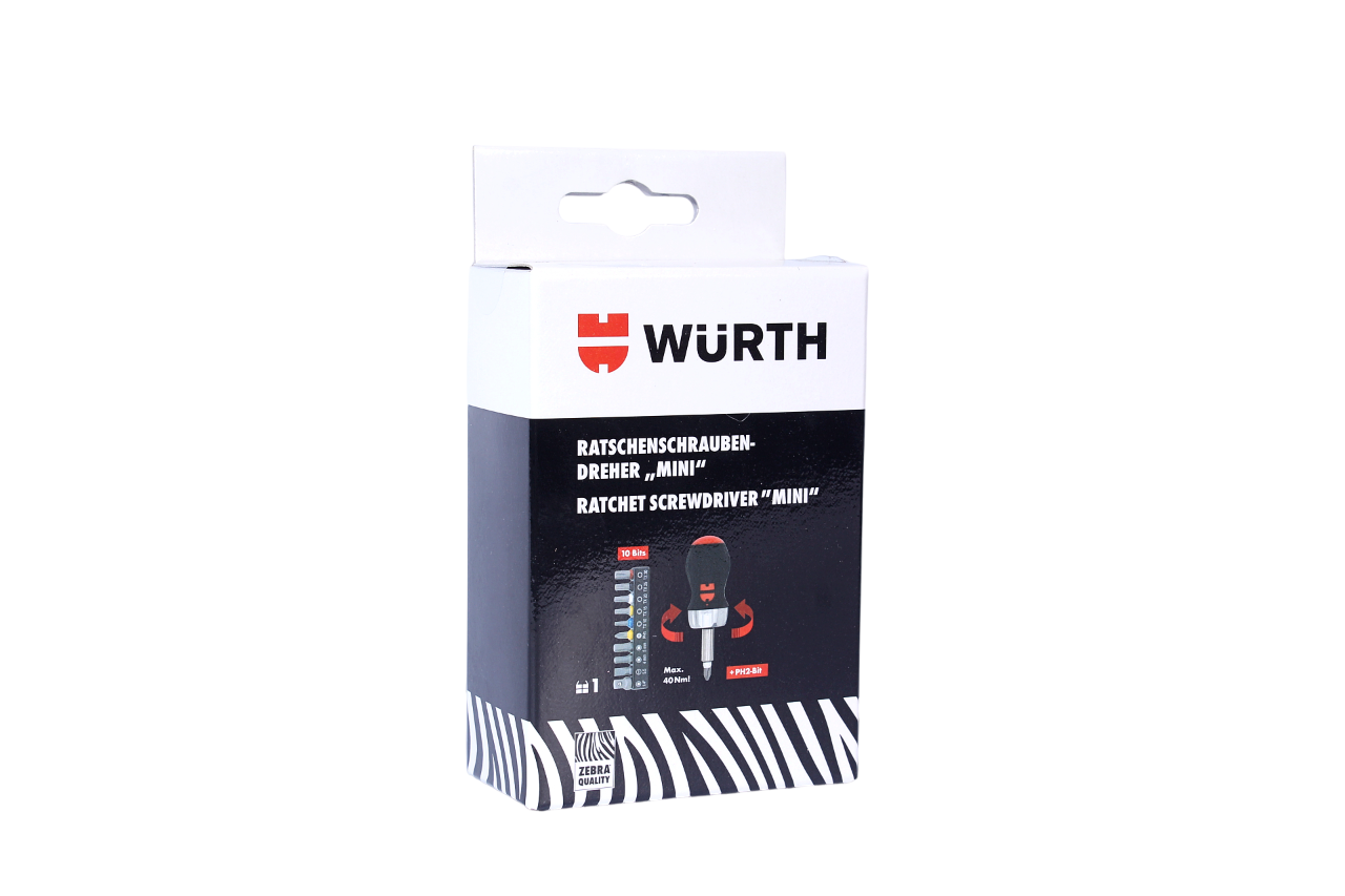 1. Wkrętak z grzechotką WÜRTH ZEBRA + 10 bitów i bit PH2: profesjonalny mini wkrętak grzechotkowy zaprojektowany do pracy w miejscach trudno dostępnych. Idealny do serwisu, warsztatu i zastosowań domowych.
